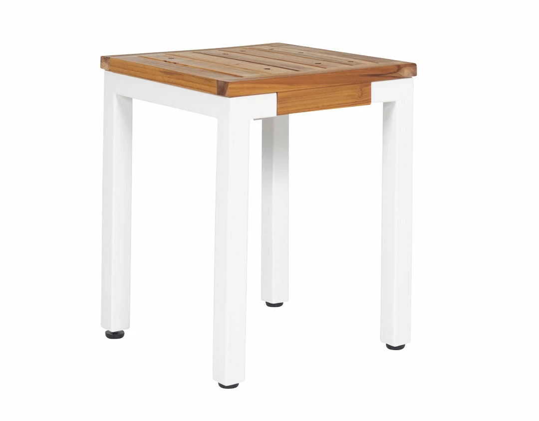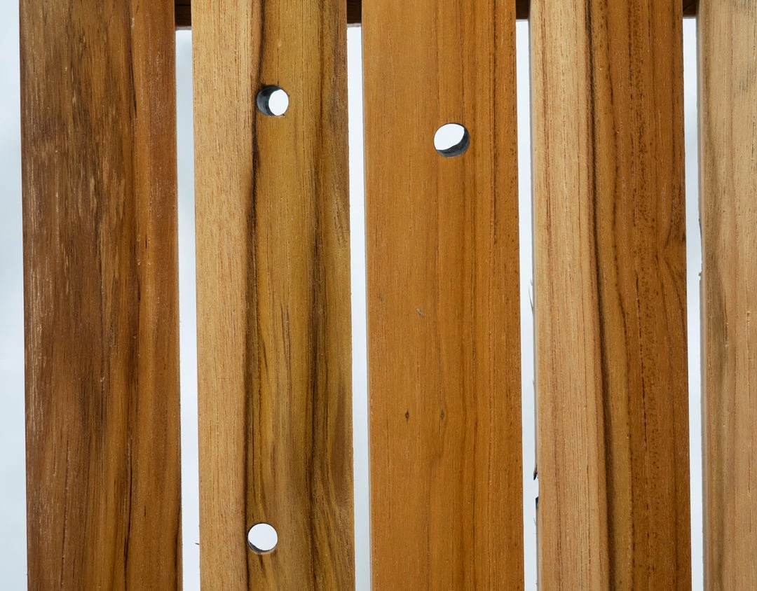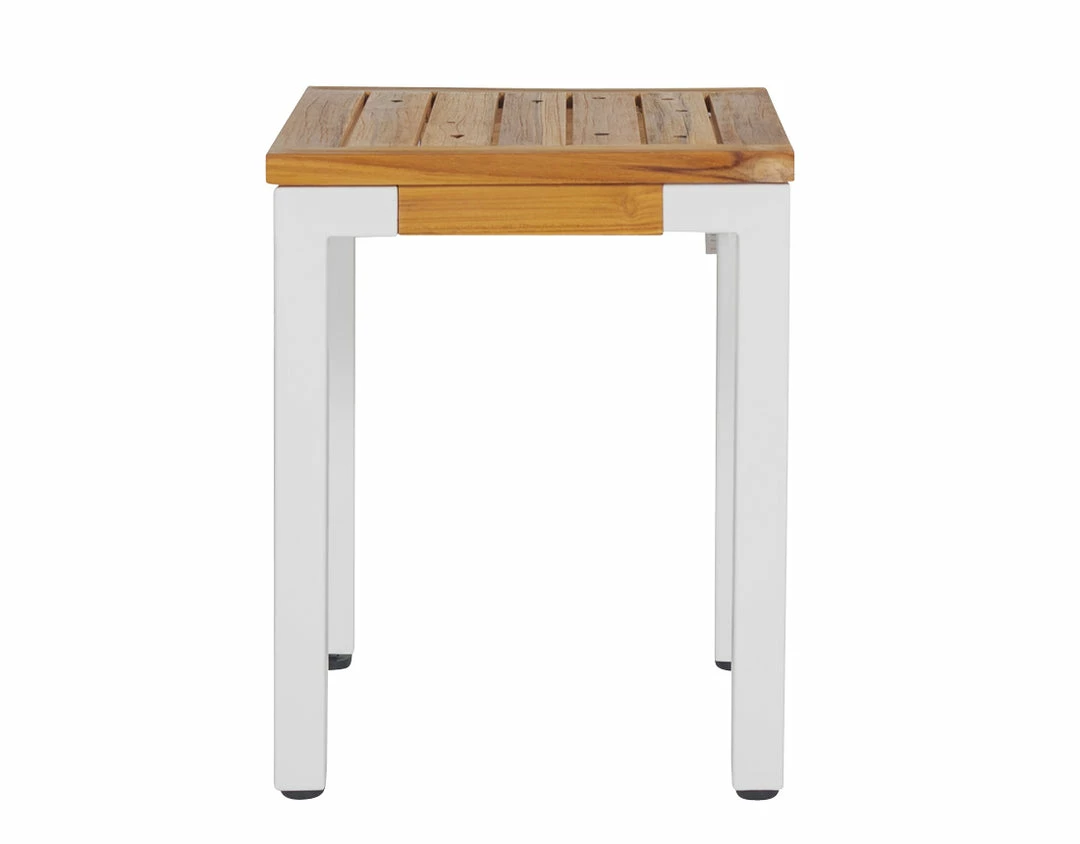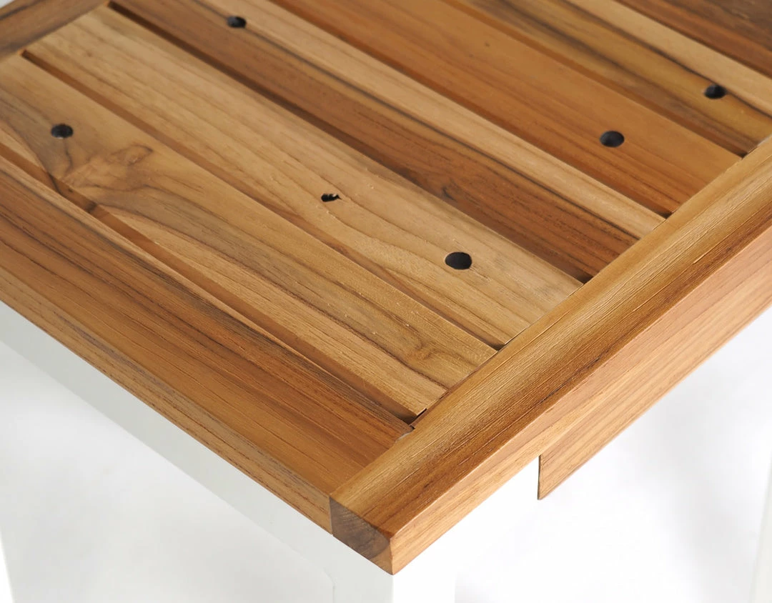 Crafted from sustainable plantation teak this collection combines Natural Rustic Sustainable Teak, white powder coated metal legs and a beautiful herringbone designed top. The perfect addition to your Resort Living Oasis.