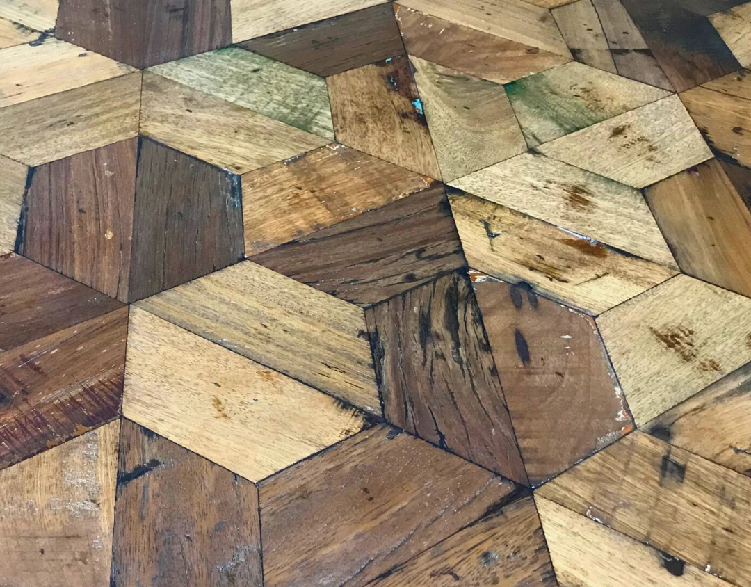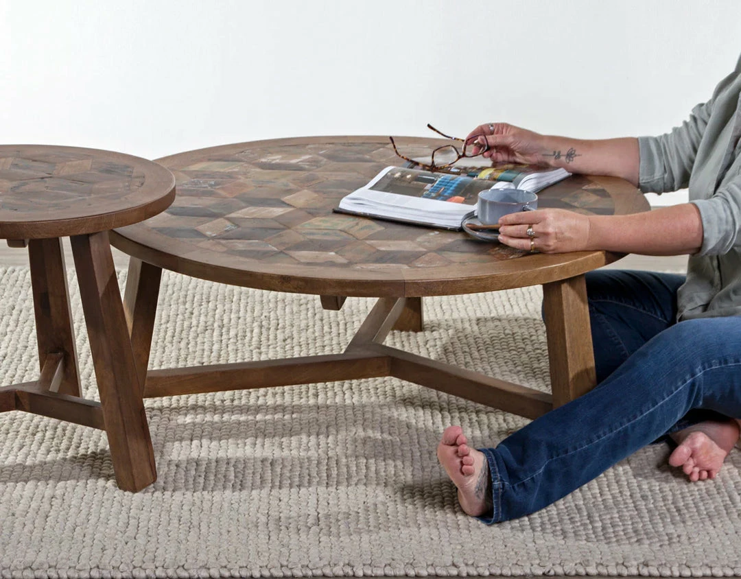 Combining the old with the new, the Hinterland Collection features a geometric design surface with a mango wood trim edge. We combine individual pieces of reclaimed timber to create its characteristic look, each piece is delicately placed by hand into this intricate design.