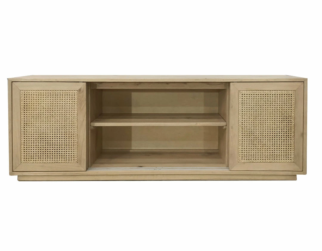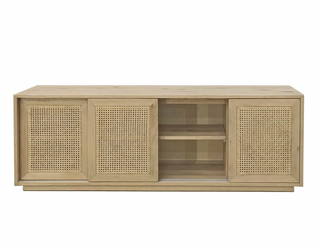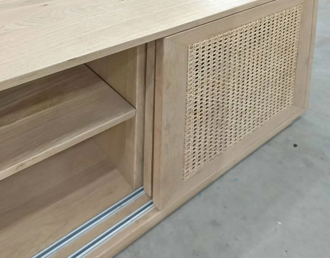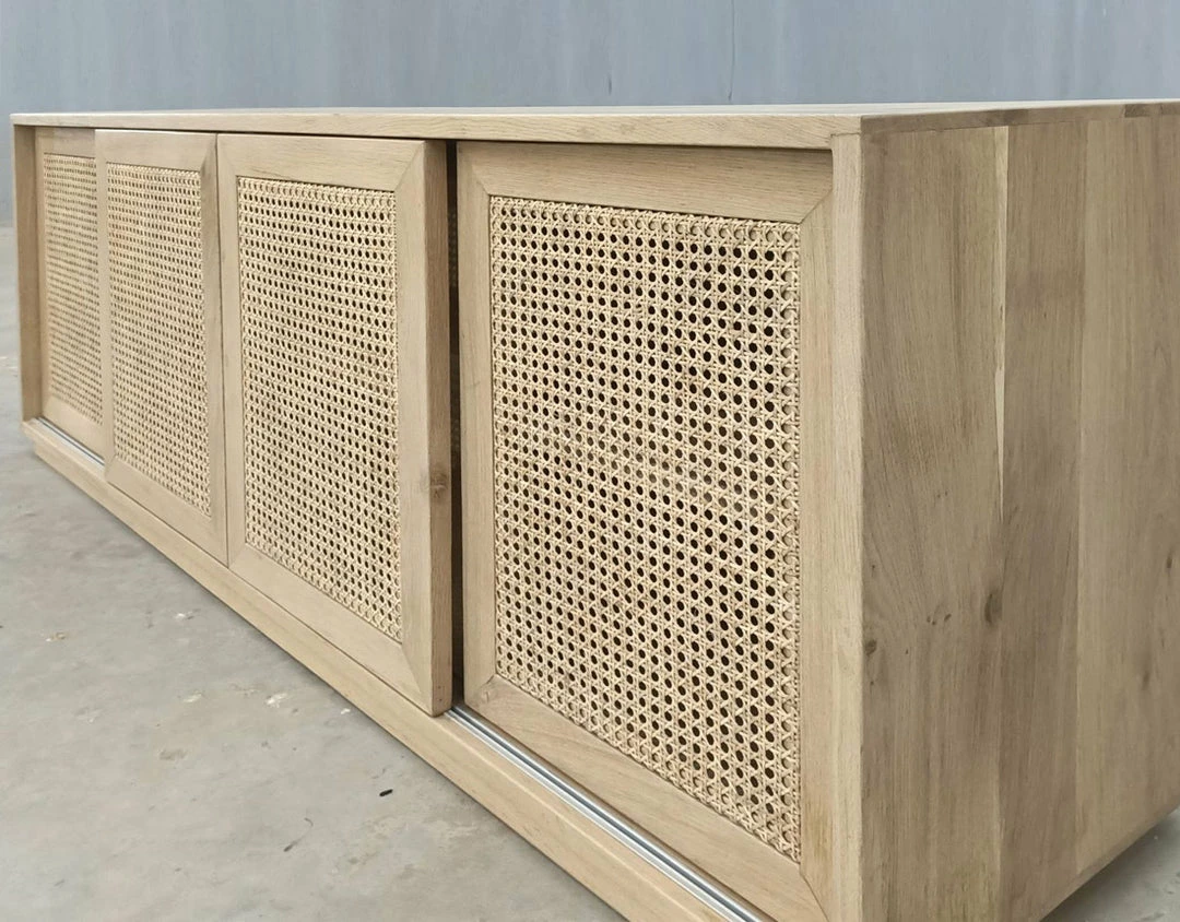 - Rattan insert sliding doors on metal tracking for smooth closing.
