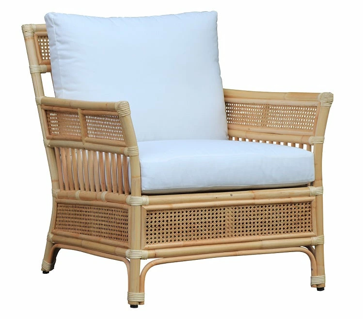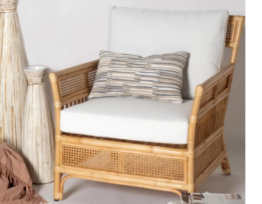 The Rivers Collection Arm Chair features a stylish modern hand woven design giving your home that taste of coastal elegance. Paired with a natural fabric soft back cushion and seat which makes it perfect to snuggle in with a book or simply to relax on those warm weather days.