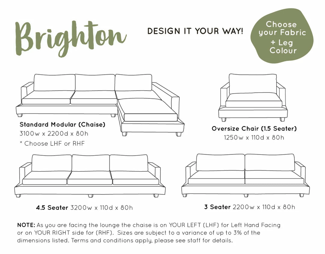 Made to order in 3 Seater Lounge, LHF or RHF Modular Chaise, XL Modular Chaise and Oversize Arm Chair.