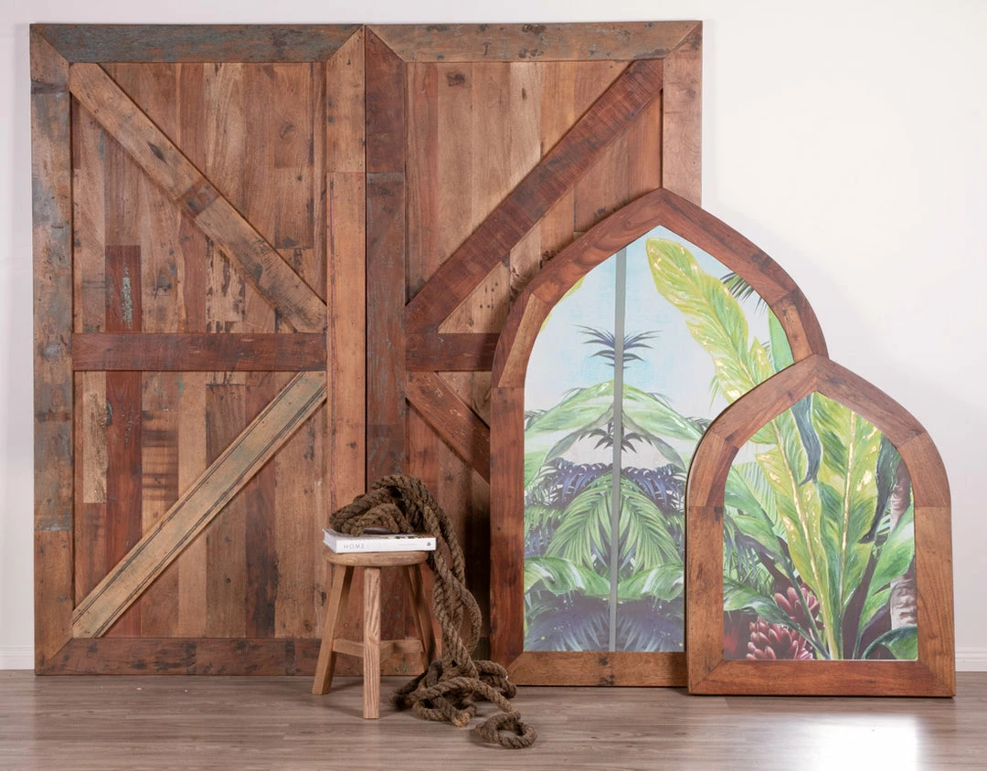 Inspired by travels to exotic locations and modelled from traditional temple windows and arches. These divine mirrors are handcrafted from salvaged timbers, with the original markings and textured left intact.