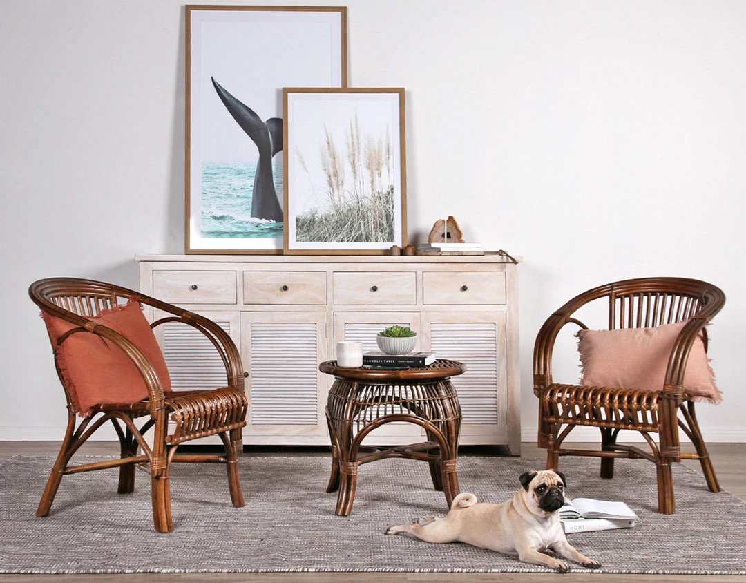 Hand crafted by skilled artisans our Tambo Collection creates a vintage relaxed style in any home. Constructed with sustainable Rattan Kulit, this light weight chair will add elegance to any space.