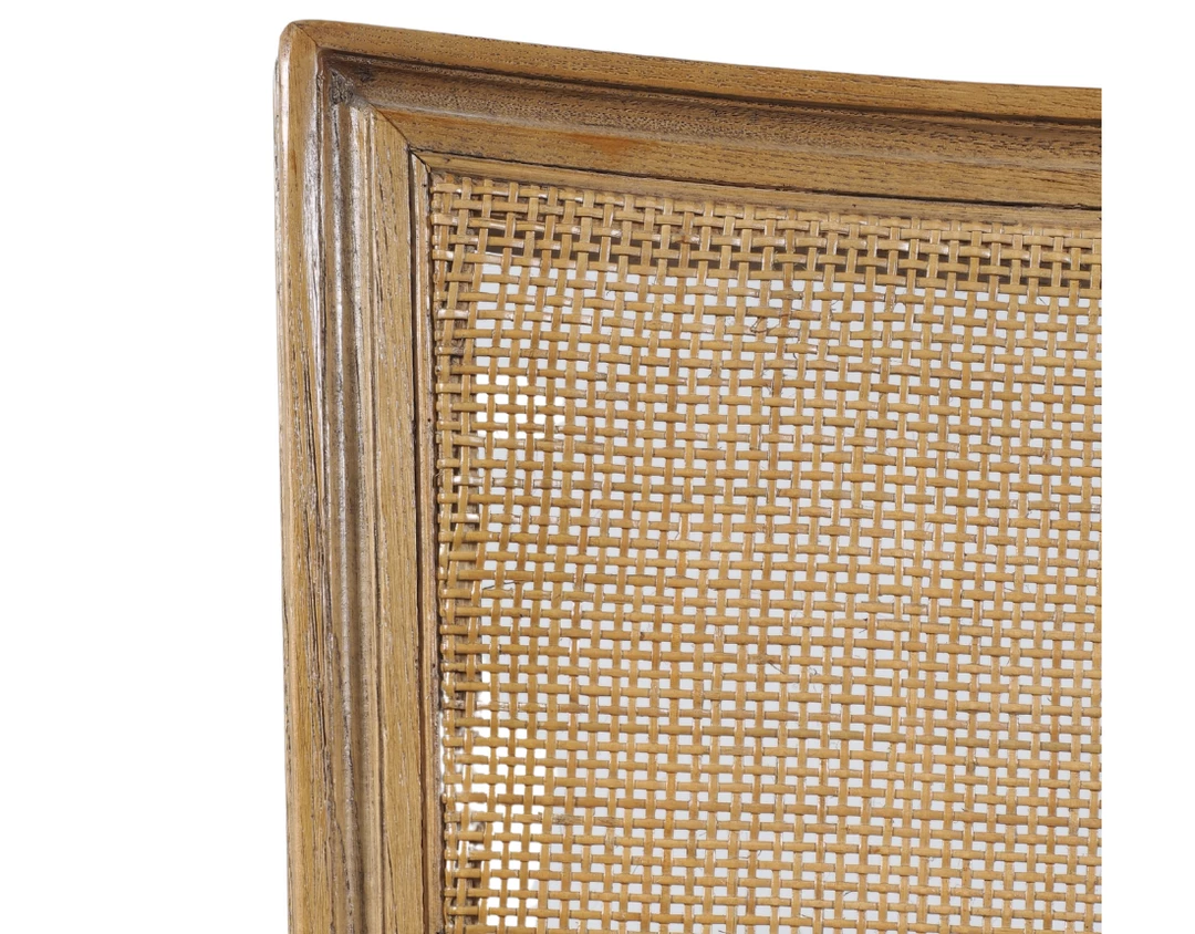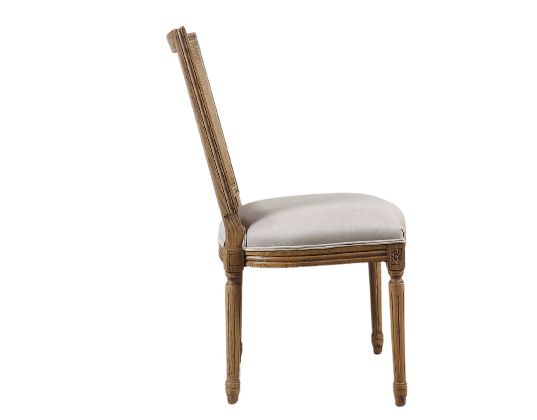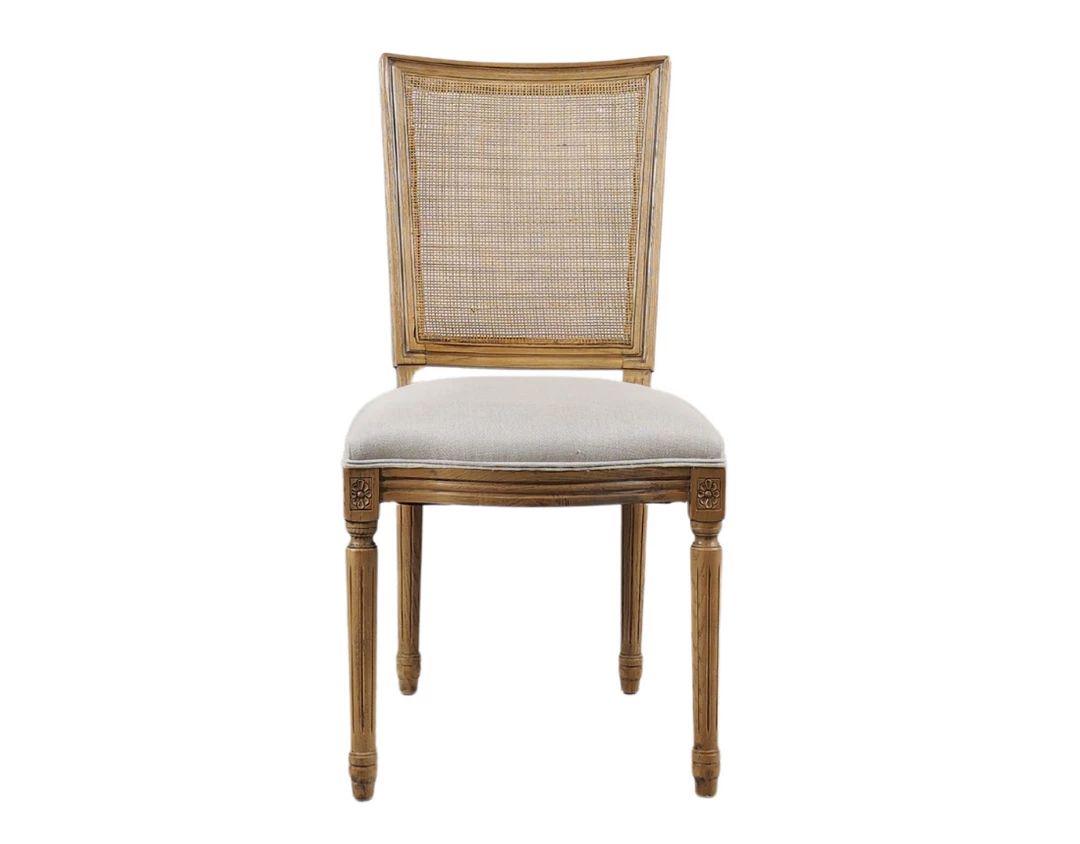 The carved timber frame is detailed with carved flowers, the Via Roma also features a rattan back insert and antique white fabric seat, perfect elegant provincial dining chair